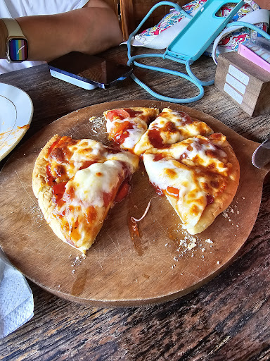Read moreThe pizza in the photo costs 100k Rp. It's made using off the shelf dough, very sweet tomato sauce, some cheese and a couple of slices of tomato. They forgot to give it, and after 40 mins when we enquired when it may be done, they went and got it.