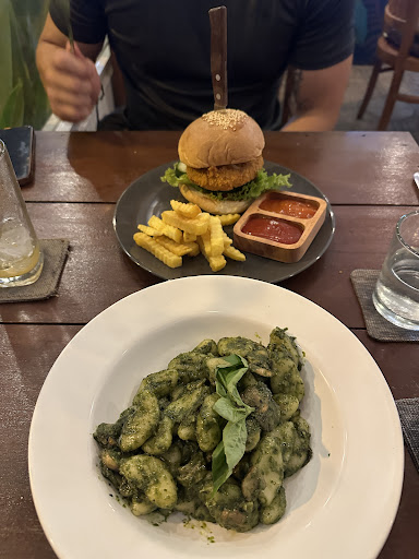 This place has very good service. They give you complimentary cucumber water, and check on your meal. We came here twice because my boyfriend loved the tempeh burger. As a meat eater myself, I even thought it was delicious and taste like fried chicken. It was really good. I had the prawn pasta which was really good but a very small portion and it only has two small shrimps that were chopped in half so a bit disappointing to consider it a shrimp dish. The dip with the chips appetizer was also small. I had the pesto gnocchi the next time which was good, but for my own personal preference it was missing the Parmesan taste which of course you wonāt get in a vegan dish. I did want to try it though as all the reviews say it was the best pesto they ever had. The dish was also very filling. I couldnāt finish it. The calamari was a very nice appetizer as well.