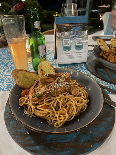 I thought the seafood pasta was nice, despite this not being an Italian restaurant. My girlfriend thought the Arrabbiata pasta was not amazing and a little bland. We both liked the wine.