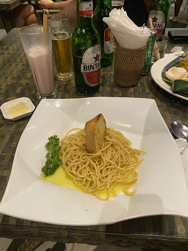 The food is very disappointing, Oglio olio serve only with a slice of garlic baguette 🥖 and excess oil/olives oil. Doesn’t taste anything but olives oil and spicy, no salty or tasty. Leave it untouched on the table cuz honesty I can’t eat it (my friends ate it as they’re hungry😂). Oglio olio is my favorite pasta at all times, I’ve tried it in most of Restaurants in Bali but in here is very tasteless.