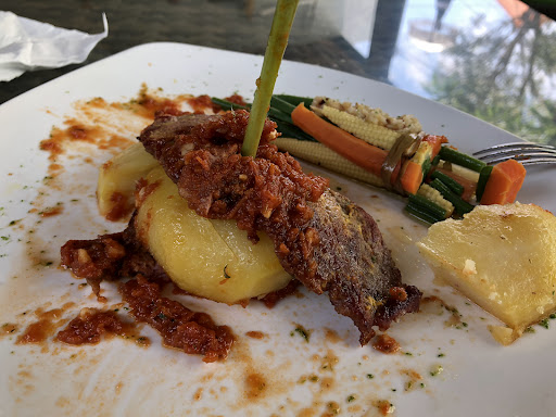 Really lovely restaurant. I had the crispy chicken roll which was so good! And my partner had the chicken in the creamy mushroom sauce which was also delicious. They weren't the biggest portions (I got the impression other stuff on the menu was) but perfectly filling. You can only book before 6.30 and we were told to arrive after 7 and wait for a table. We got there just after 6.30 and were seated within 5 minutes, a lot came after that and had to wait a while. The service was excellent and the setting really nice, I can see why it's so popular. The prices are a bit more than the menu on the restaurant, but it was about average for lembongan prices and some of the best food we had on the island.