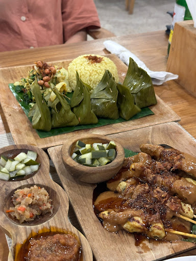 The dish consisted of a generous serving of fluffy, fragrant rice, topped with several small portions of different side dishes. These included flavorful chicken satay skewers, tender shredded chicken in a rich curry sauce, tuna sate lilit with a sweet and savory sauce, and a refreshing vegetable salad with a tangy dressing.