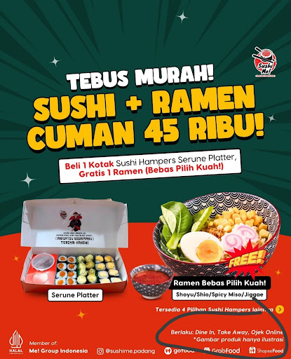 salah satu faktor yang membuat aku mau datang kesini adalah promosi yang sushime tawarkan di Instagram nya. sebagai mahasiswa siapa sih yang gamau makan ramen dan sushi dengan harga terjangkau wkwk. di Instagram aku lihat ada paket 45k sushi+ramen yang aku pikir itu cukup worth it. aku cari informasi nya lagi, promo tsb berlaku dine in take away dan pemesanan online, ditambah komentar admin yang mengatakan promo tersebut berlaku seterusnya. ehh pas nyampe sana malah dikasih tau kalo promo nya ga berlaku wkwk katanya cuma bisa pemesanan online. mau cancel dine in kan malu jadinya wkwk.