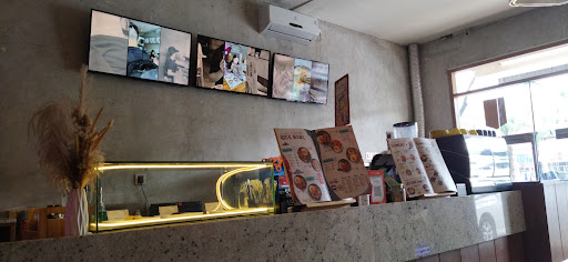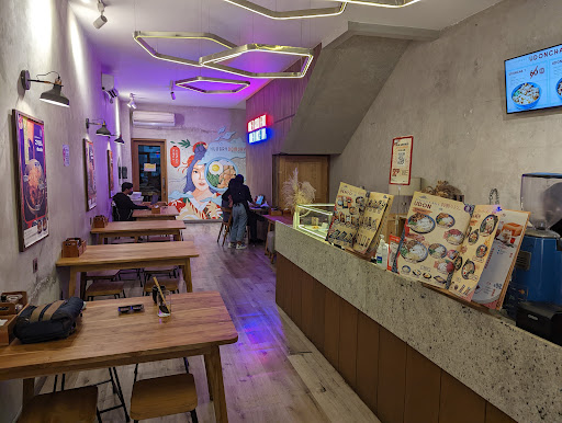 Read moreKe sini karena liat review google bagus dan gue lagi pengen ramen (walaupun jadinya beli udon) wkwkwkwk Tempatnya kecil panjang gitu, ada 7-9 meja kalo gak salah. Tapi tempatnya enak sih, sejuk. Pelayanannya ramah, terus langsung pesen di kasir, jadi kalo mau cepet ya liat menunya dulu di google wkwkwk Untuk harga makanannya tuh yang ricebowl 50rban, udon 50rban, ramen 80rban, snacknya 30-50rban, dessertnya 20rban, minumannya bervariasi dari 20-50rban. Porsi ricebowlnya ngenyangin, cukuplah buat yang laper dan porsi makannya normal. Buat udonnya ternyata banyak, padahal kondisi gue abis main badminton dan lapar wkwk terus ramennya kayaknya gede banget porsinya kalo ngeliat harga wkwk Beef udon yang gue pesen tuh yang pedes gitu (lupa namanya) ada 3 level, dan pas gue tanya katanya tiap level agak beda, beda 20gr sambelnya kalo gak salah denger. Gue orang yang suka pedes, pesen yang level 2 itu lumayan pedes dan nikmat banget buat gue. Udonnya gede dan kenyal banget sumpah, enak! Beefnya juga banyak, gak pelit sama sekali! Terus yang makan ricebowl tuh lidahnya selektif ya (alias lidah rumahan yang gak makan aneh-aneh), tapi katanya enak. Untuk matcha lattenya enak banget, dia lebih ke manid dibanding pahit. Untuk strawberry teanya asem, seger enak gitu. Terus buat gyozanya enak banget! Isinya daging cincang gitu, juicy banget, sampe orang yang lidahnya selektif tuh ngabisin gyozanya wkwkw yakitorinya juga enak, rasanya tuh bbq, manis gurih gitu, ayamnya lembut dan potongannya gede, terus bawang daunnya juga lembut, enak dah. Kalo dessertnya tuh namanya pia. Ada 3 varian, coklat, keju sama durian. Teksturnya tuh kayak kulit piscok tapi lebih lembut, enak, anget wkwk dessertnya bisa minta disajiin abis makan. Oh iya, lantai 2 tuh khusus kitchen, toilet sama mushola kayaknya kalo liat simbolnya mah, belum ke sana...