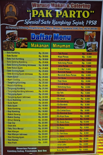 Β Β Β Read moreRumah makan pak Parto ini sudah lama ada, dari thn 1958, resep turun menurun. Untuk daerah skitar sini agak susah cari makanan enak, beruntunglah ada pak parto..hehe. Dsini jual makanan olahan daging sapi, kambing dan ayam seperti sate, tongseng, dsb. Satenya di sajikan tidak pakai tusuk sate, jd gak pakai ribet. Rasanya lumayan enak dan rasanya tdk berubah dari sblmnya kami datang ksini. Menu paling enak tongseng kambingnya. Harganya termasuk murah ya per porsinya, krn ukuran 1 porsinya sedang, gak terlalu banyak jg. Pas klo kataku sih. Gak kaya di jakarta yg kalo pesen 1 porsi, sizenya to much. Jadi klo di pak parto ini, bisa icip2 menu lain dan gak mubazir jadinya, like it. Untuk menu dan harga...