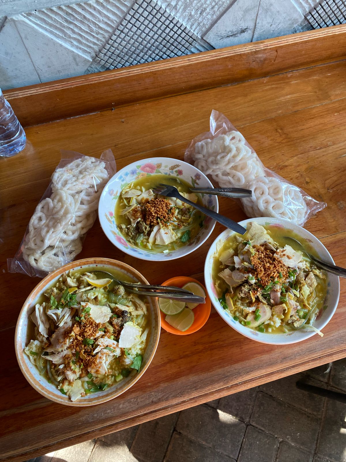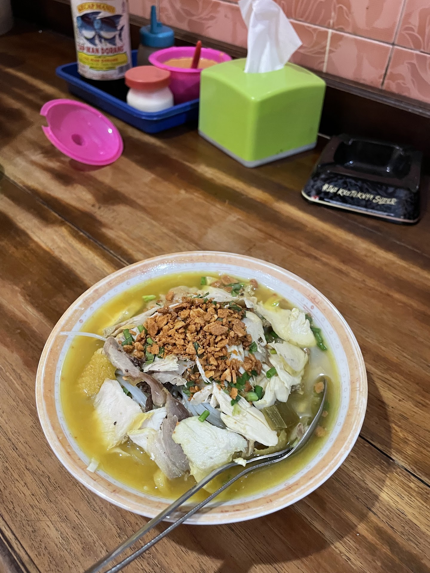Β Β Β Read moreTermasuk jenis soto ayam lamongan. Dalam satu porsi soto ayam terdapat nasi putih, sohun, ayam kampung suwir, irisan daun kol, bawang putih goreng, irisan daun bawang yang kecil-kecil, dan kuah soto ayam. Porsinya lebih banyak dibandingkan porsi umum saya sebagai wanita dewasa dan mengenyangkan untuk pria.