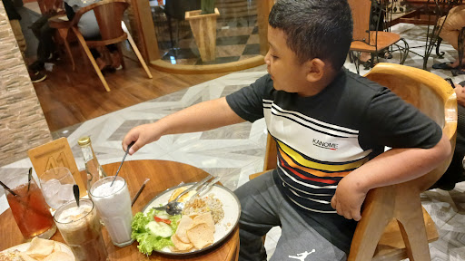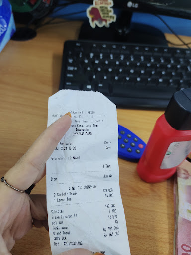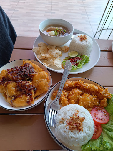 Ok mulai dari datang, parkiran motor rapi disebelah resto, parkiran mobil kurang rapi, akibatnya saat mobil yg parkir didalam mau keluar susah harus minta mobil lain keluar dulu, ini mengganggu ya kalau si pemilik mobil sedang nikmat2nya makan😁 Staf ramah, mulai dari tukang parkir, frontdesk dan waiter ramah, good👍 Saat pemilihan menu, sayangnya tidak ada gambar menu nya, saran saya kasi gambar menu makanan dan minumanya, bukan hanya tulisan, soalnya buku menunya tulisan doang, kalau ada gambar pasti lebih menarik😁 Suasana kafe, kebetulan saya datang malam hari, lantai dua agak gelap pak, ada live music tapi gelap, dibelakang masih kurang lampu, sayang padahal live musicnya ok, sayang penerangan kurang,😆 lalu posisi live musicnya, tertutup taman kalau kita duduk di kursi sebelah tangga, tapi saya lebih terganggu gelap nya sih, kayak remang2 gitu, tmbahin lampu pak😁😁 untuk menu tadi datang lumayan cepat, rasa nasi goreng nya enak, stik ayam krispi nya kurang garing sedikit, potongan ayamnya tebal rawan tidak matang, untungya tadi matang, karena sebelumnya saat kunjungan pertama pernah pesen menu yg sama ayamnya mentah, yg sekarang ok tapi masih kurang garing sedikit🫡 minuman ok semua yg saya pesan, es mokacino nya enak, sip, Pas bayar tadi juga ada kendala, mau bayar kasir masih belum ready, pake qris wifi gak nyambung2, akhirnya , pakai tethering hp saya bisa😁, ini rawan kena komplain pak, sebaiknya kasir udah ready kalau ada yg mau bayar2, apalagi kalau pas rame overall lumayan ya, suasana, rasa makanan dan service 7/10, semoga semakin baik ke depan nya, soalnya lokasi udah oke tinggal ditingkatkan aspek...