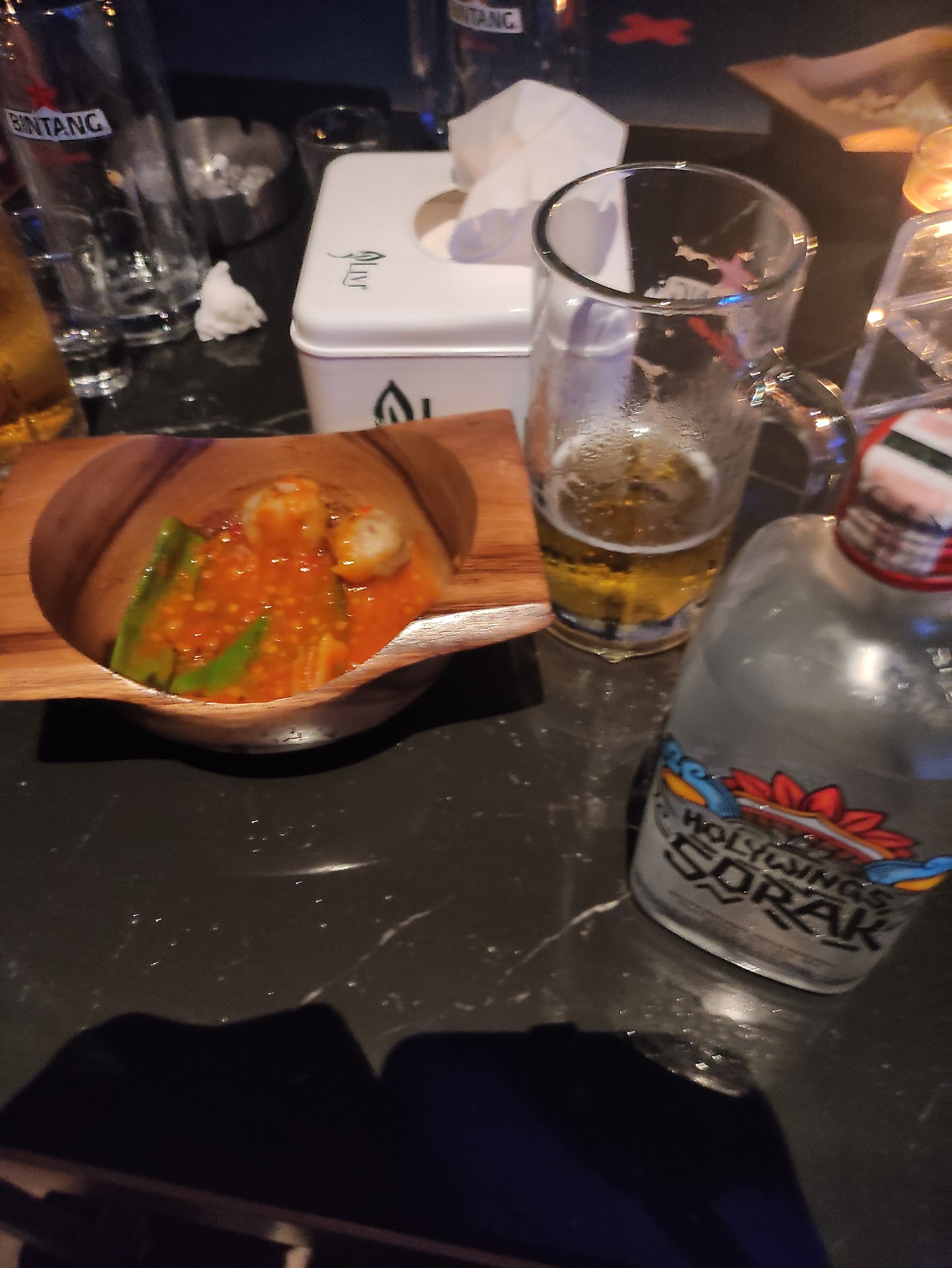 Tidak boleh foto atau camera didalam. Jadi cuman foto bagian luar saja as a token to show that i was actually there. (cuman bole foto bagian luar doank buat pamer kalo gue tuh pernah kemari) Sebelum masuk cuci tangan dulu. Abis tuh masuk dan setiap hape cameranya ditempeli sticker oleh mereka. Setelah itu di periksa tas dan badan nya oleh security sebelum diijinkan masuk ruang utama. Ruangannya remang-remang gelap. Di sebelah kiri pintu masuk ada bar panjang yang majang beragam minuman (gak sebutin jenisnya takut tar kenapa-kenapa pulak). Di sebelah kanan terletak stage buat live band. Tempat duduk meja kursi berada di tengah2. Musiknya terlalu keras buat telinga gue. Gue cuman bertahan sekitar 15 menit didalam. Sempat ke toilet sebentar. Trus cabut pulang gak order makanan atau minuman. Kuping jadi bunyi 'ngiiing' gitu abis keluar dari sana. Bagi gue ini cuman tempat minum doank. Percuma dandan dan pake baju bagus, karena gak kelihatan juga didalam. Sulit sekali untuk ngobrol karena musik terdengar keras sekali. Gue pribadi tidak merasa...