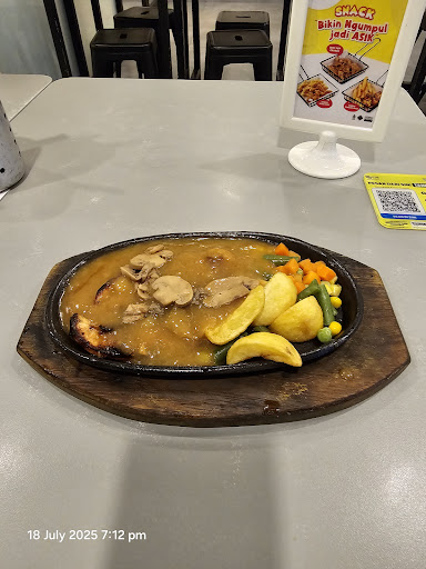 Β Β Β Read moreSaya baru datang lagi kejaringan resto ini setelah sekian tahun lalu mencoba yg di Bandung. Perubahan terbesar adalah cara memesan hidangan. Sangat efisien bagi pemilik resto Krn pelanggan lgsg memilih sendiri menunya dan membayar di kasir. Namun, utk pelanggan yg datang sendiri saat resto sedang ramai agak menyulitkan karena belum dpt meja tetapi harus menulis nomor meja saat di kasir. Hanya ada seorang waiter yg membawakan pesanan, alat makan, asbak, mengosongkan meja yg telah selesai digunakan dan membersihkan. Sibuk sekali. Sangat efisien bagi pengusahanya tetapi sangat kasihan pegawai tsb, terutama di jamΒ² sibuk. Saya memesan menu panggang, beef bulky dgn spaghetti, dan hal yg agak mengganggu bagi saya hanya saus yg terlalu banyak. Dagingnya empuk. Mungkin lain waktu saya akan mencoba ayamnya entah yg bulky atau BBQ. Untuk yg goreng tepung, belum ada selera untuk mencoba. Kalopun akan coba, mungkin yg selera Indonesia,...
