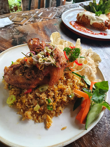 Nasi goreng ayam betutu Sekali lagi, rasanya cukup hambar khususnya untuk ayamnya, rasanya kurang meresap, jadi daging ayamnya hambar tidak ada rasa sama sekali dan cukup kering banget ayamnya, makannya bikin haus karena terlalu kering Tapi nasi goreng nya cukup lumayan rasanya
