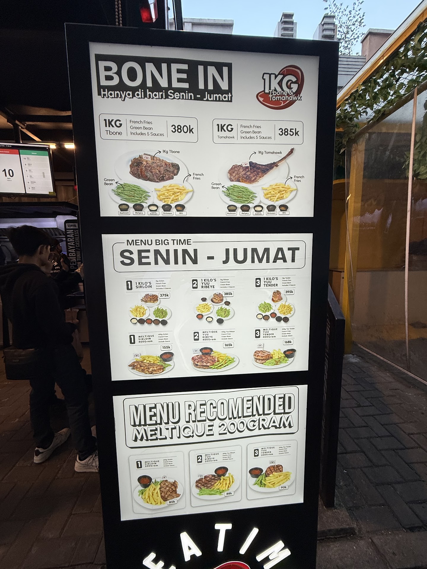 It’s a nice small steakhouse. I ordered Meltique Tenderloin Steak with mushroom sauce during my visit. My steak doneness was medium rare, while my brother ordered medium. My steak was a bit undercooked with a lot of silver skin. However, my brother’s steak was good. Maybe the best way here is to have your steak over medium doneness. The fries is good, and the green long bean is even better. I have to say however, it was an enjoyable yet simple dining experience. The sauce is refillable and you can change it (like, from mushroom to BBQ or black pepper) once yours is finished too. Order the blackcurrant syrup or lemon tea for some freshness after eating the steak. I visited the restaurant at night, around 7-8 pm, slightly long queue, but pretty fast paced and turnaround. Fill a waiting list with how many person is with you, and when your name is called, make your order on the screen, pay with QR (Qris), and wait. Once your number is ready, go to your prepared...