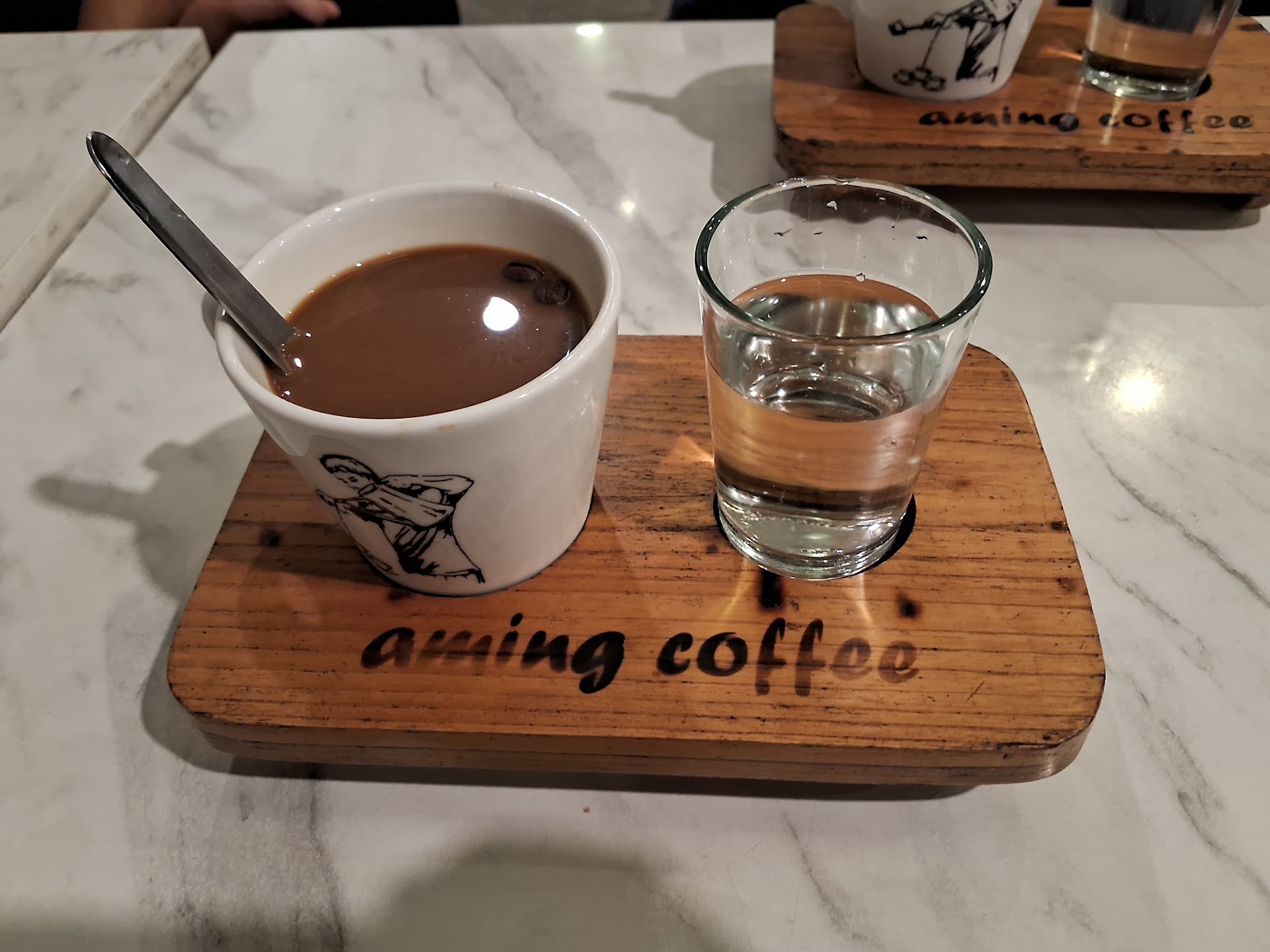 Untuk kopinya tergolong light dengan aftertaste yang tidak terlalu kuat jadi lebih balance di lidah. Cocok buat yang tidak terlalu tahan dengan rasa kopi yang strong. Disajikan sepaket dengan satu sloki air putih sebagai penawar, cukup worth it.