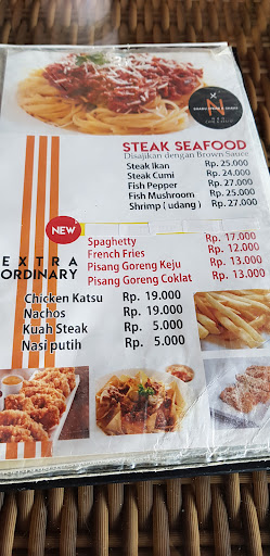 Steak originalnya yg lokal enak. Cuman agak kecil sih dagingnya, sesuai sih sama harga 30rb. Penyajiannya pakai hot plate dgn brown sauce dipisah. Yg di foto ini daging wagyu bbq (impor) harga 85rb. Agak gak begitu suka, kurang berbumbu sih mnurutku. Masih suka wagyu d tempat lain. Kalo untuk steak daging biasanya sih enak. Steak lokal dgn harga merakyat lah....