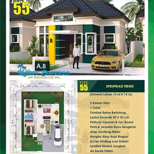 KARET EMPERIO RESIDENCE Jalan Karet - Pontianak Barat 🏠 Type 55 elegant / Tunggal Luas Tanah 10 x 14Meter ✓2 Kamar Tidur ✓1 Kamar Mandi ✓ Pondasi beton bertulang ✓ Lantai keramik 50 x 50 ✓ Plafond Gypsum board & GRC ✓ Pintu & Jendela kayu bengkirai ✓ Atap genteng metal ✓ rangka baja ringan ✓ Air bersih PDAM ✓ Listrik 1.300 √ Bonus • Pagar Letter U • Carport •Taman Harga promo, hanya 350 jt aja..!!!!