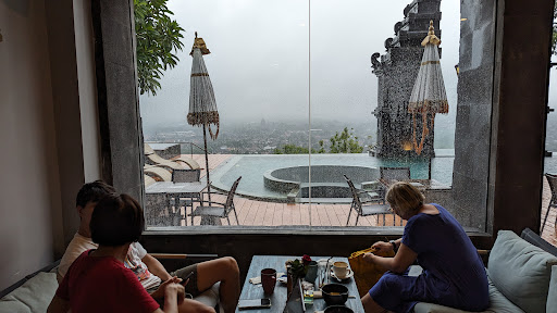 Ā Ā Ā Read moreBeautiful place to eat on top of a hill across from Prambanan, with a pool, delicious food and a few villas if you like it so much you wish to stay overnight! It was pouring rain when we visited, but the view was still gorgeous, though covered by the fog. The outside deck with the pool looked amazing, the interior is spacious and modern, with comfortable chairs and seating arrangements for large and small groups. The staff were attentive and we were able to park downstairs so we could avoid getting rained on. The food was delicious as was the coffee and the service very quick (though we were the only ones there at this point). Mixture of Indonesian and western food - I had the flamingo yogurt bowl, yummy, sweet and fresh. Please note you must pay a deposit when you arrive before you order, probably to discourage those looking to just take photos but not...
