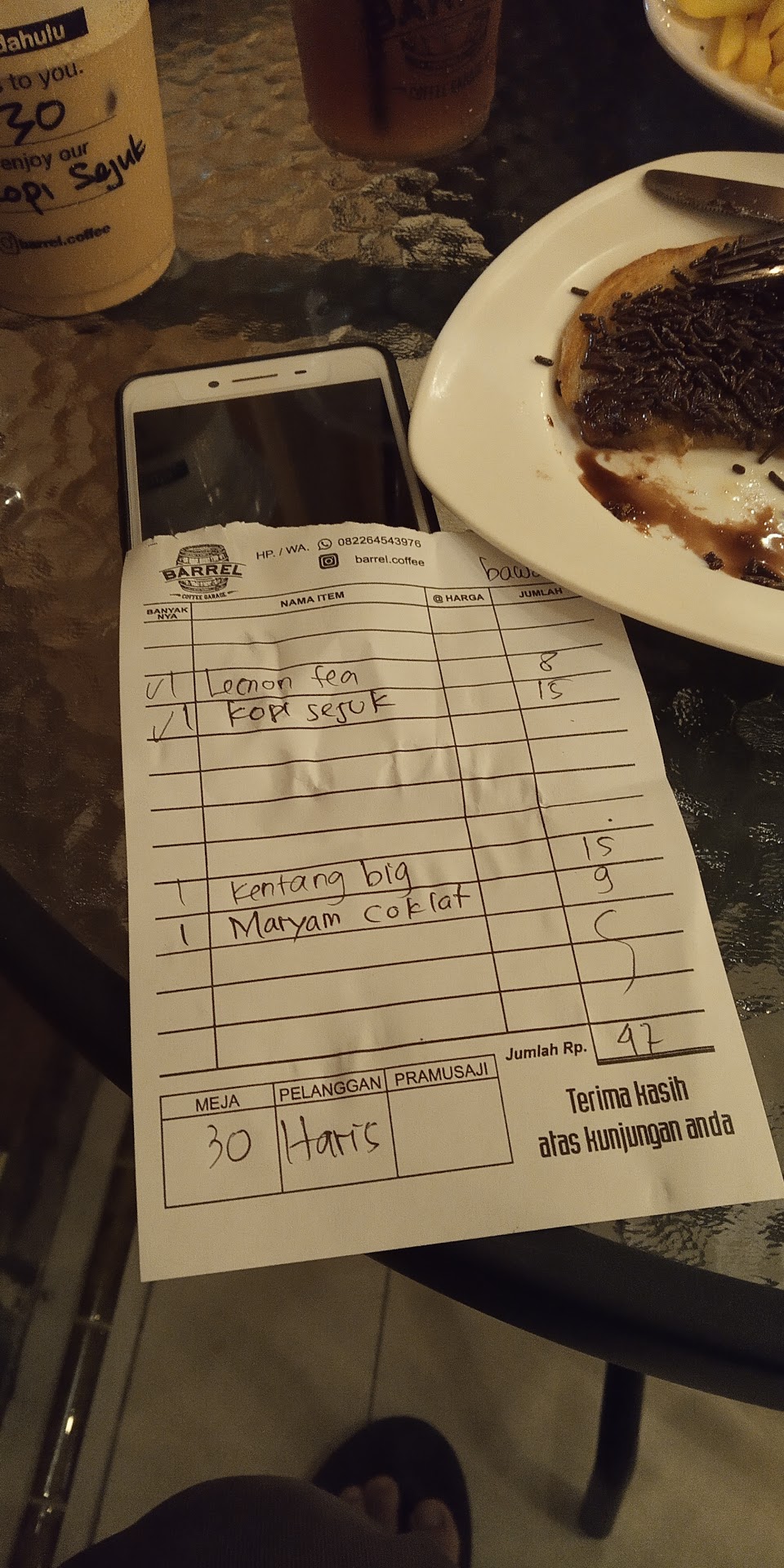 Parkir: Kebetulan saya membawa sepeda motor, jika ada kawan-kawan yang membawa mobil mungkin akan sedikit kesulitan karena lokasi Cafe yang masuk gang dengan jalan yang tidak terlalu lebar. Tapi kalian sesekali boleh mencoba ke Barrel membawa mobil.