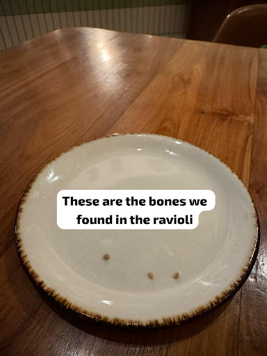 We ordered the oxtail ravioli, it arrived cold but the worst was that we found large bits of bones in this dish. Unfortunately, my wife had bitten into at least 3 pieces of bone and hurt her teeth. We acknowedge that some little bones can can end up on plate unintentionally due to various shortcomings or carelessness in the supply of the meat or when preparing the mince, but once we expressed this to the restaurant, the response we got nothing short of abhorrent.