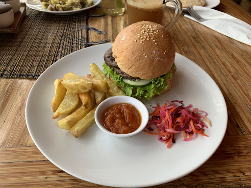 Cons The service was terrible, they didnt notice us when we came in. The staff was chatting amongs each other and didnt pay attention to the guests my ginger beer wasn’t so much a ginger beer as it was just ginger the food was bland. No seasoning whatsoever. My fries where soggy after swiming in the Portobello burger juice. The burger didnt have any condiments (i.e. No ketchup, no mayo, no mustard etc.) the charges atleast double from everywhere else. There are better alternatives. Check out the ”love burger” at ”Clear Café” (100 meter walk from ”Earth Cafe” the worst part was that on our bill they had added a 40k ”service fee” on top of our food. And when handing them the money they didnt want to give me my 2k change. 2k is not alot of money, but weird for them to assume Id want to tip them. bathroom was not clean. There soap dispenser what filled with just water