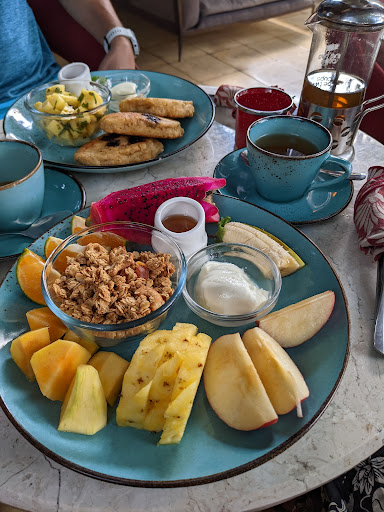 On our tour of the property while being guided to our room, we saw the Spa (didn't get to visit, but it's also in a treehouse) and the dining area. Because we stayed on a Saturday night, we were able to take advantage of their EXCELLENT Family Dinner night (100k per person). Any & all guests are invited to join, but we were the only 2 who chose to this day so we had a private multi course meal! There were 2 delicious salads, 3 mains + rice, corn, eggplant, and fruit for desert. It was all classic Bali cusine and the staff (Ardika) did a fantastic job of explaining all the dishes to us - and local traditions too! We had a great evening and everything tasted fresh and flavorful.