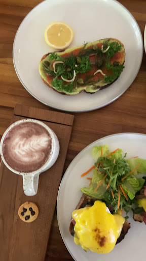 Food & Drinks • Smoothie Bowl – A vibrant and refreshing blend topped with fresh strawberries, bananas, chia seeds, granola, and coconut flakes. Every spoonful was a delightful mix of creamy and crunchy textures. • Avocado Toast – This dish was perfection on a plate! The creamy avocado spread, topped with microgreens and crumbled feta, was beautifully balanced. The addition of poached eggs and a zesty green sauce elevated the dish. • Salmon Tasmania – This was a standout! A deliciously fresh slice of sourdough topped with smoked salmon, capers, and dill, with a side of lemon to enhance the flavors. Every bite was light yet satisfying. • Eggs Benedict – Perfectly poached eggs over sautéed greens, mushrooms, and ham, smothered in velvety hollandaise sauce. The side salad added a refreshing touch. • Fresh Fruit Platter – A tropical medley of mango, dragon fruit, watermelon, grapes, and banana, beautifully arranged and bursting with natural sweetness. • Coffee & Hot Chocolates – The hot chocolates were rich and creamy, with gorgeous latte art, while the iced coffee was smooth and well-balanced.