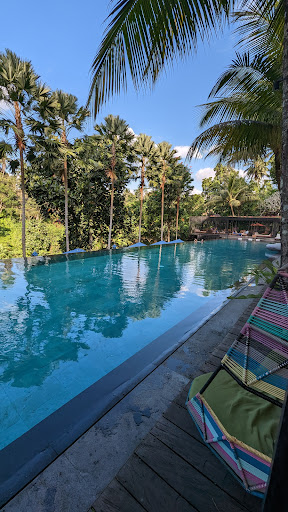 The Facilities & The Vibe. After a walk down into the heart & soul of the location, you see the pool overlooking the green brilliance and radiance of the jungle. JF is lined with day beds, sofas, caves, and tables. The bathrooms could and probably should be better but after eating, drinking, and wading in the water, it took me until now to identify that flaw. I took an excursion outside of JF to pursue the location (the chapung sebali property) and that chill, zen vibe flows everywhere: in the flora, the architecture, choice of woods, artifacts. All intentional like the chill, lo-fi music played at JF.