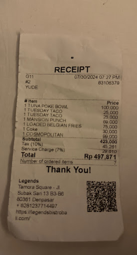Read moreAttended Christmas lunch in here. Preordered and prepaid. Ended up waiting for our food and drinks to come for more than 1 hour! We were 2 hours late due to personal obstacles, but some of those who arrived on time got their food and drinks even later, so some people were waiting for more than 3 hours! We got ours after I asked to give us money back as we desperately wanted to leave. The event was terribly organized in general - people were just sitting, talking, nobody even tried to suggest some fun activities to make this hustle less unpleasant. They knew how many people would come, what time and what day, they new what everyone ordered, they knew it was a Christmas Day. So, have no idea what could be used as an excuse in this case. Worst experience ever! It seems impossible to ruin the positive vibe of such a wonderful day as Christmas, but organizers and restaurant management managed it! Saw one of the negative reviews was written by one of organizers, blaming restaurant in all the problems, but “Where were you, man?” On the top of all I’m “enjoying” a stomach ache now. UPD: The fact that Jl. Legends posted so many fake five star reviews after getting a bunch of complaints from Christmas lunch is so disappointing and tells so much about the place...hey, what about 100% refund for all the...