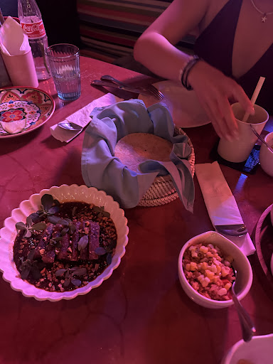 all three of us ate the exact same for our meals starting with guacamole and chips, corn with sour cream and cheese and a pork taco with some sort of dipping sauce. then for mains we were bought chicken quesadillas, pork belly and duck so we could make our own soft tacos. at this point i could feel the bloating, it felt like a massive balloon in my stomach about to pop. for dessert we were bought traditional mexican rice pudding (this i did not try as im not a fan of rice pudding) as well as churros with caramel sauce and dark chocolate sauce. (my partner not having any dessert as he was also feeling bloated and full).