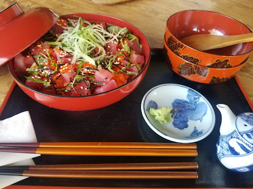 Japanese kitchen plating traditional fare in tranquil quarters with a leafy yard & deck.