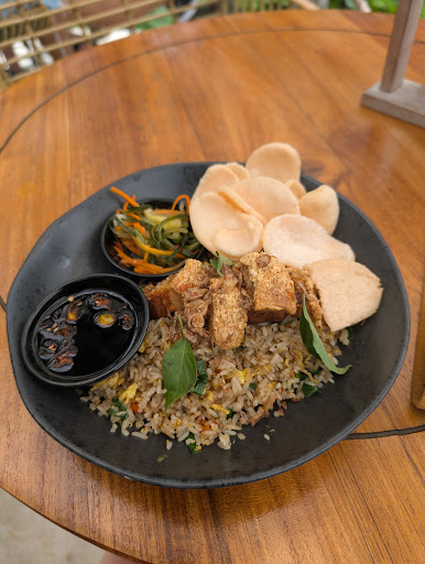 Food: mediocre, got nasi goreng there were like 3 pro belly cubes - I asked for more protein, got salmon - this tiny dried out tail end piece pictured came at idr60k (extra protein top up price).
