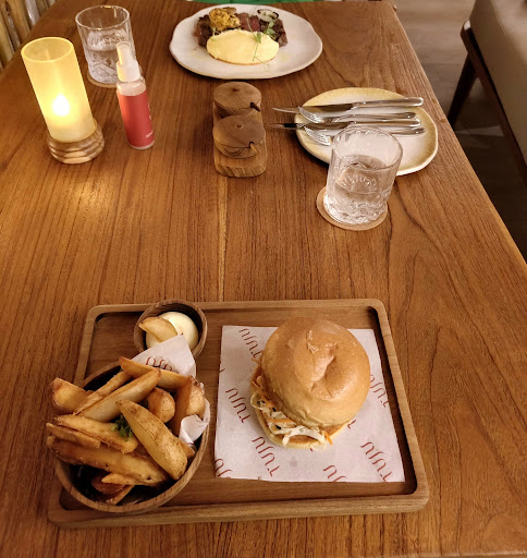 We started with the garlic bread, which was honestly the best I've ever had. For the main course, we enjoyed a delicious Wagyu steak and a crispy chicken burgerâboth were perfectly cooked and bursting with flavor. For dessert, we had the tiramisu and lemon tart, which were the ideal sweet ending to our meal. We capped off the evening with an Amaretto Sour and a Peach Gletserâboth drinks were delightful.