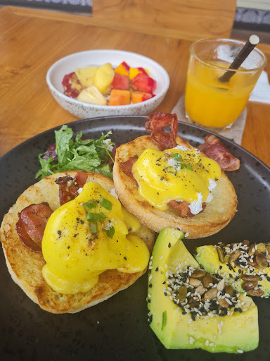 We got the benny brunch deal which is probably the best deal for brunch ever! It came with your choice of fresh juice and coffee or tea. For the eggs benny dish, you can choose what kind of side you want as well as the protein. Lastly, a small chia pudding included with the deal. Getting so much bang for your buck with this deal, only 150 IDR ($15aud!!) 🤗