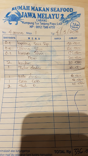 We had 500g of prawns, small size seabass, 2small crabs, vege, eggs and rice...not forgetting drinks.. it came up to a total of only Rupiah 336 000. D price is really reasonable to me as iv eaten elsewhere before and this is one of the cheaper ones u can get. You may wana calculate those into SGD and try to get that price elsewhere, along with views and fish nursery...