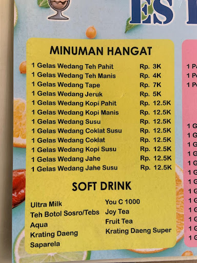 Kedai ini menjual berbagai macam menu es seperti es campur, es kesambi dan lain-lain. Serta menjual menu makanan seperti mie acar dan lain-lain.