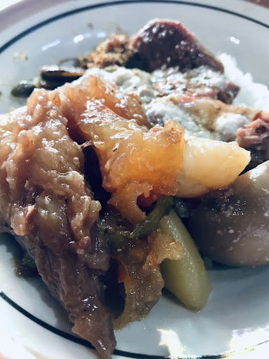 Nasi gudeg campur for only 25k. Inside got shredded chicken opor, half boiled egg, sambal goreng labu, braised potato, veggie (im not sure what its made ofš) beef skin and beef tendon (my favourite, so tender n bouncy jelly like)