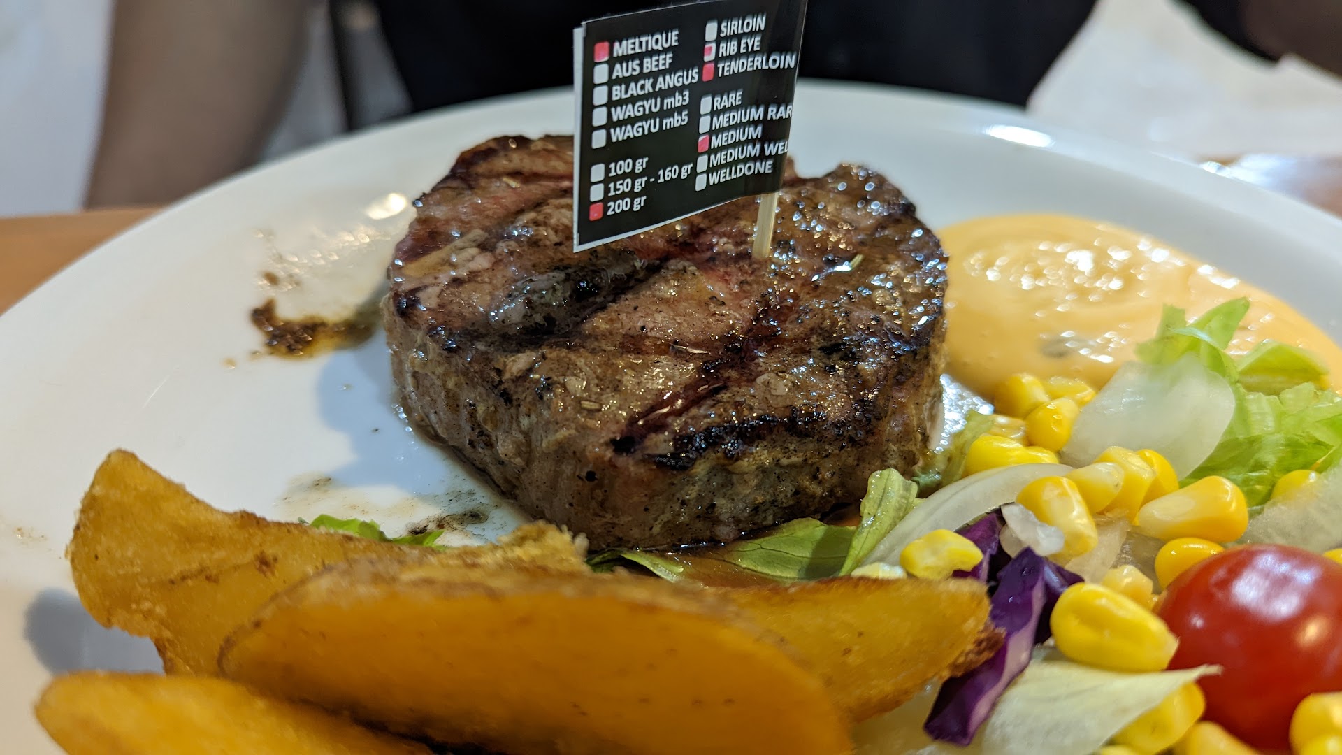 The name suggests a tender steak a.k.a tender loin, but the steak is not as tender as I expected. However, the doneness is quite okay.