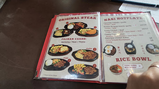 tersedia pula menu: steak sirloin, tenderloin, wagyu meltique, cordon blue, japanese yakiniku & korean bulgogi (gurih/manis; chicken/beef). minumannya beraneka ragam: milk shake, coffee, fruit juice, soda, tea, & ice cream-nya yg wajib coba!