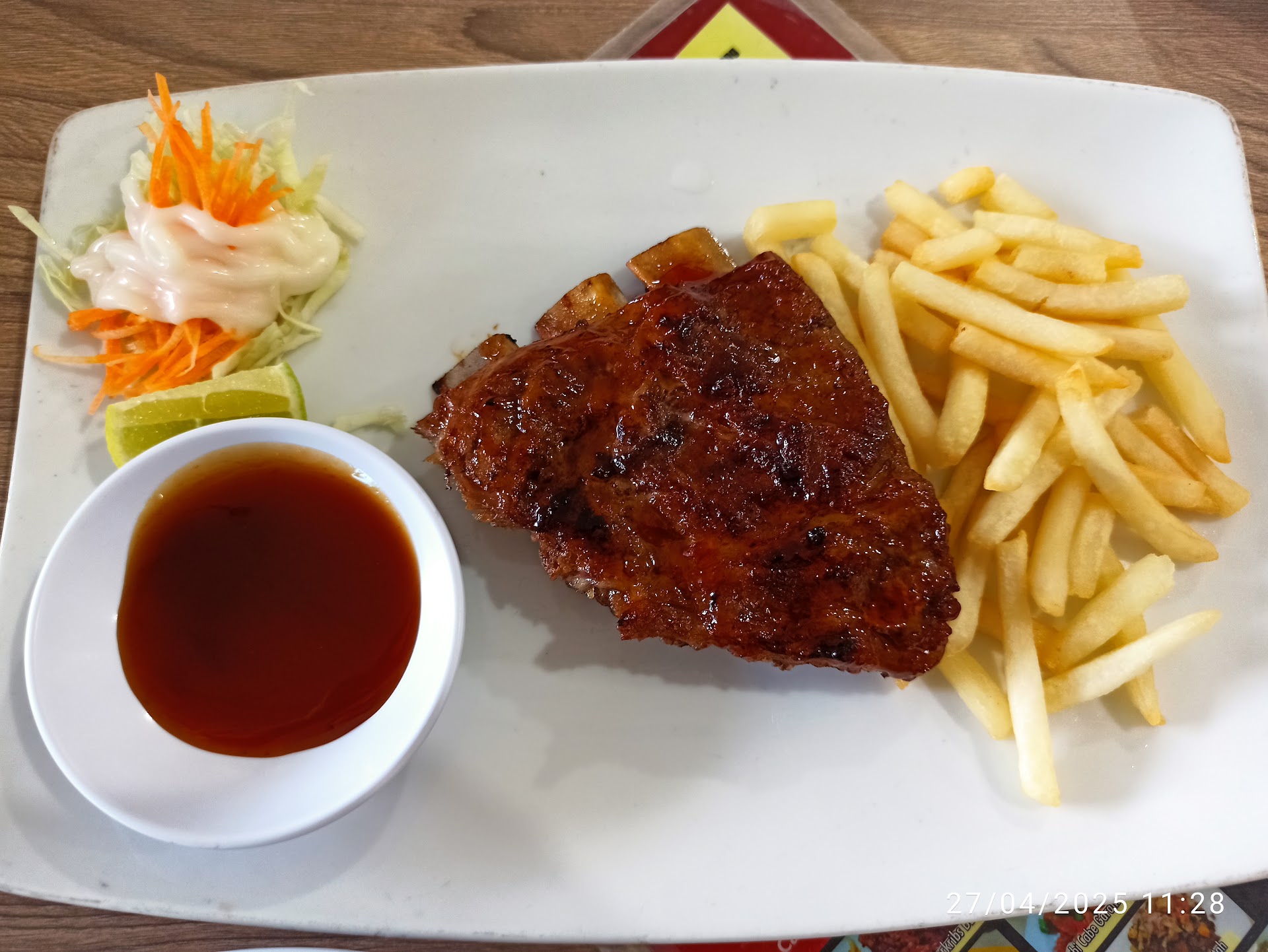 Dalam kesempatan ini, saya mencicipi dua menu andalannya, yaitu iga babi (pork ribs) dan pork knuckle. Tekstur iga babi di sini empuk. Daging iga yang dibalik kulitnya juga sangat empuk dan juicy, dengan bumbu marinasi yang meresap hingga ke serat daging. Rasa bumbunya gurih dengan sentuhan manis ringan, berpadu dengan rempah-rempah khas BBQ yang lezat.