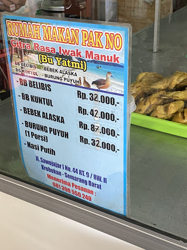Read moreIwak Manuk Pak No adalah salah satu tempat makan legendaris di Semarang yang terkenal dengan sajian daging burungnya yang unik dan lezat. Bagi para pecinta kuliner petualang, tempat ini adalah surga bagi mereka yang ingin mencoba makanan yang berbeda dari biasanya. Menu andalan Iwak Manuk Pak No tentu saja berbagai jenis burung seperti bebek, ayam kampung, burung puyuh, dan bahkan burung kuntul. Daging burung yang disajikan sangat empuk dan bumbunya meresap sempurna. Rasa gurih dan sedikit gamey dari daging burung menjadi ciri khas yang disukai banyak orang. Makan di Iwak Manuk Pak No adalah pengalaman kuliner yang berbeda. Anda akan menemukan berbagai jenis burung yang mungkin belum pernah Anda coba sebelumnya. Selain itu, cara penyajiannya yang sederhana namun berkesan membuat makanan ini semakin nikmat. Suasana di Iwak Manuk Pak No cukup sederhana dan homey. Tempat makannya bersih dan nyaman, cocok untuk bersantap bersama keluarga atau teman.