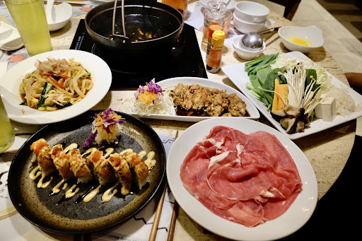 Normal shabu2, VERY thin slices of meat, mediocre to subpar dipping sauce taste (the ponzu and goma sauces taste weird), the sushi is using cheaper meat than expected. A moriawase with 2 salmon bellies and 1 tuna nigiri, but both of them are very LEAN, even the salmon belly had almost no fat, hence tasting bland. Tuna nigiri had no fat at all, also bland. The rest are crabstick nigiri, tamago, and tobikko gunkan which are an economic set for a moriawase. The saving grave is the unagi nigiri, although I'm hesitant to call it a nigiri. The unagi kabayaki was good, tender and melts in your mouth, great with white rice. The fried inarizushi tastes like cheap normal fried sushi, don't bother. I'll give 3 stars just for the unagi and the atmosphere, with a note that the music choice kind of...