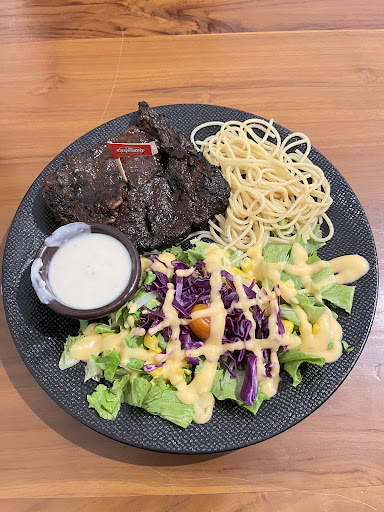 Aus Ribeye steak (medium), pas dateng kaget karna bentuk nya ini ga rata, warna gelap bgt kek gosong, tp di dalam nya masih merah. Ini aku pesen kemtangan medium. Pas kunyahan pertama stok bgt, karna sealot itu daging nya, bener” kaya karet yg di kunyah ga abis” smpe mulut kerasa cape bgt buat ngunyah. Disini -+ 5 suapan udh pengin nyerah buat makan tu steak, karna nafas panjg trs buat sabar” in ngunyah, smpe bikin emosi bgt. Pas di awal mkn udh pgn ngebuang bgt, Itu pun hmpir setengh nya ga kemakan.