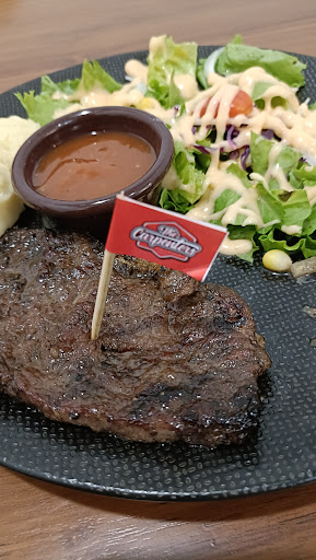 dagingnya juicy bgt, bisa pilih tingkat kematangan (well done, medium, rare, dsb). saus-nya lezat (rekomendasi kami smoke BBQ & mushroom). mash potatonya lembut, enak. TOP! kopinya jg OK, mantap! 👌