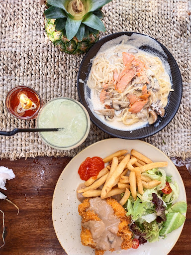 Read moreIf you came here at day, I think you will feel the beach vibe more rather than at night. Really crowded at weekend, luckily I only need to wait for about 15min. Quite spacious, they have 2 floors and a lot of photo spots. They have a system where you look at the menus and ordered it by phone. The menu are not that varied, and when I came a lot of menus are sold out, including the platter🙃. So I ordered: Signature Crispy Duck (78k). It was so tender, big, and seasoned enough. The rice also smell good. You will got 2 different sambal, but for me their matah tasted better. Chicken Maryland (55k). Just like usual chicken maryland, it was deep fried, and has a really crunchy texture. Minus point is I have to waited for over then 20min, when the waiter said that food will come maximum at 15min. White Truffle Carbonara Salmon (88k). Out of all menu that we order, this pasta has the smallest portion, and I personally think that it was a lil' bit salty. Same as chicken maryland, this one also took over than 20min, and when it came its not even warm... Hawaiian Chicken Burger (68k). Exceed my expectations, the bun itself tasted good, and also big. Inside of the burger, there's cheese, pineapple, pickles, etc, which make the burger portion so big. They also gave you french fries. Overall I really like this one. Hawaiian Chicken Steak (55k). Kind of same with chicken maryland, the difference is just this one is grilled while maryland is deep fried.