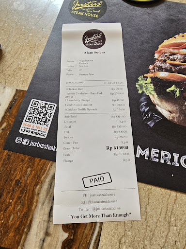 Dari yg paling utama dlu, kualitas makanannya. Sesuai dengan namanya, Steakhouse, menu andalannya adalah Steak. Coba pesen Sirloin Entree Steak, enak banget. Dagingnya empuk gak alot and chewy tapi juga gak lembek banget. Juicy, dan bumbunya well-marinated, meresap sampai ke dalam-dalam dagingnya. Menu lain yg juga recommended, Cheesy Chicken Burger. Tipikal burger klasik dengan isian komplit, perpaduan daging dan sayur yg fresh, keju yg melted, dan roti yg renyah. Menu lain yg agak ringan, cobain Chicken Truffle Spinach. Olahan daging ayam yg gurih dan crispy, dengan bumbu truffle dan tambahan kentang goreng dan sayur bayam. Minumannya juga gak kalah, kopi Royal Creamy Aren enak banget, kerasa aroma kopi yg khas, dan Orange Juice yg terasa bulir dan cita rasa buahnya. . Berikutnya, soal tempatnya. Konsepnya seperti EcoGreen resto, yang menyediakan ruang terbuka dengan dihiasi banyak tanaman dan pepohonan. Di dalam ruangan juga menggunakan jendela kaca besar untuk pencahayaan alami sehingga mengurangi ketergantungan lampu. Keseluruhan resto ditata dengan sangat rapi, cocok untuk yg bawa keluarga, bawa anak kecil, ataupun nongkrong sma teman buat lebih santai. Fasilitas lainnya berupa wastafel yang bersih dan cukup menarik. Dan yang terpenting ada Musholla yg luas dengan suasana yg menyejukkan. . Tambahan lainnya, soal pelayanan. Dimulai dari hospitality dri security yg memandu parkir mobil, trus disambut dengan pegawai yg mencarikan meja yg available, dilanjut dengan yg mencatat pesanan dan yg juga mengantarkannya. Semua dilakukan dengan pencatatan digitak sehingga tidak ada pesanan orang yg kelupaan atau tertukar. Bahkan alat makannya pun dikemas dengan elegan. . Makanan enak, harga terjangkau, pelayanan terbaik,...