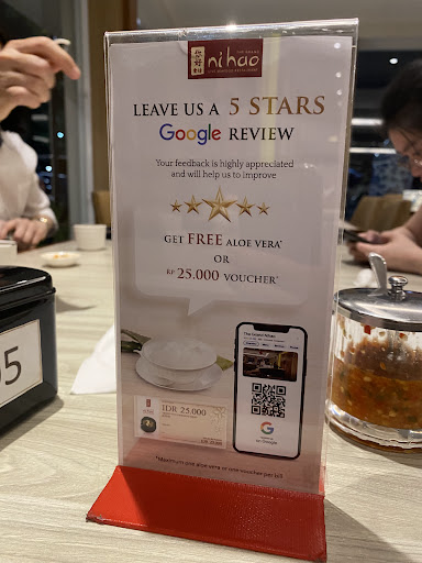 Concerning to see card holders on tables offering rewards for 5-star Google reviews, which raises questions about the authenticity of their positive feedback.