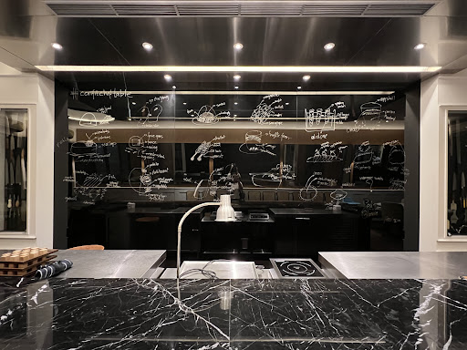 Lalu saya gak paham fungsi nya duduk di chef's table itu apa? Toh chef ny masak di dapur dlm lalu bawa ke meja. Cmn blg nama menu trus kita liatin tembok lagi donk. Atraksi yg dilakukan chef cuman pas ngasih pepper pake pepper grinder raksasa sama platting 1x. Dari 12 menu kami cuman ngadep tembok. Sama liatin PAJANGAN pisau, kompor di chef table itu.