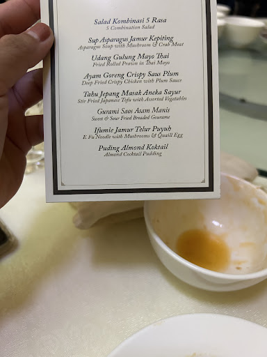 Read moreAku mau kasih review berdasarkan apa yang aku makan minggu lalu yaaa, kesini karena ada undangan nikah saudara, oke langsung kita review makanannya sesuai menu yang disajikan. Salad Kombinasi 5 rasa, ini terdiri dari salad buah dengan mayones yang manis, sama ada beberapa sayuran, rasanya tentu enak yaa, terus ada semacam lumpia kecil2 krispi dan lembut di dalam. Sup Asparagus Jamur Kepiting, seperti sup kepiting pada umumnya dan rasanya hampir sama dengan resto lainnya. Udang Gulung Mayo Thai, ini enak banget sih adonannya semacam roti goreng dengan tepung panir gitu, unik rasanya, gurih krispi. Ayam Goreng Krispi Saus Plum, enak dan unik juga rasa ayamnya. Tahu Jepang Masak Aneka Sayur, tahu susu atau sutra ya itu pokoknya yang lembut terus dengan berbagai sayuran, rasanya yaa biasa aja sih. Gurami Saos Asam Manis, waah ini enak banget sih, guraminya masih fresh terus krispi diluar lembut didalam, sama kombinasi saos siramnya juga pas. Ifumie Jamur Telur Puyuh, ini mienya juga favorit banget! tekstur mienya unik, kenyal tapi bukan kenyal yg pada umumnya, bumbunya juga khas banget, enak pokoknya. Puding Almond Koktail, es dengan kuah bening dengan potongan puding dan buah, enak segar.