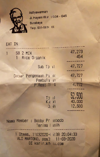 Suprisingly had an extraordinary service here. I am paying with vouchers and having trouble when I want to use my KFCKU member to earn points on the POS Computer. I gave up at first then told the cashier that it was okay not to use my KFCKU member. However, he asked me to wait a moment when he tried to put in on the next POS Computer, still failed. After that he tried it again on another POS Computer and succeeded. I was overwhelmingly happy by his effort to fulfill my request even though it was during peak hour and the queues are fairly long. Yet he keeps smiling and provide an unforgettable genuine service. Thank you! Really sorry I couldn’t remember his name but here’s the receipt of...