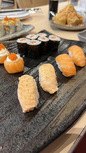 🍣Caterpillar Roll🐛 Roll ini tampil cantik banget, disusun rapi dengan topping irisan alpukat di atasnya, mirip ulat — hence the name. Isiannya ada salmon skin tempura,kanimayo, tamago dan mentimun, dibalut nasi sushi yang lembut. Dengan topping tobikko dan avocado. Rasa manis gurih dari saus mayonya bikin nagih. Teksturnya juga pas antara lembut dan crunchy dari mentimun. Skor: 1000/10