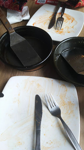 Lalu saat mau pesan manggil mbak nya.. "Mbak.." Mbaknya posisinya lgi ngobrol sma mas nya(karyawan lain).mbaknya laku datang trus bilang. "Bu .sekaramg pakai aplikasi bu.nnti bisa dpet poin ditukerin dn dkkumpulin dpet gratis barang buk" Oke..tpi kita milih lngsung pesan krna males downlod2. .harusnya kn dr awal pelayan ngasih menu bisa bilng gini "Permisi pak.bu.sekarang untuk pesan bisa melalui aplikasi pak.bpk nya mau pesen lewat aplikasi atau langsung..klo langsung mau saya tunggu atau ditinggal dulu pak? Klo lewat aplikasi mau di bntu caranya?"kan biasanya mbak2 nya gtu..kok gk gtu ya..mlah lngsung ditinggal. Pesenan udah dteng..dr mulai mkan mbak nya liatin terus..apa krna cara mkan ku yg mkan pizza pakai tangan tanpa pkai garpu..kok diliatin...kita cuek aja..emnk enaknya pizza mkan pkai tangan lngsung.. Lalu suami pesen buat di take away sklian bayar.. Pas udah selesai dan keluar mbak nya lari nyamperin suami saya.. "Pak.udah di bayar pak?" Hah.."ditanyain gtu yah.baru kali ini kita ditanyain gtu..emank mbaknya gk konfirm dulu sama kasirnya..kok ujuk2 lari nyamperin kita tanya gtu"... Aku lngsung ketawa..dipikiran ku dr awal mkan sampai selesai.Oh.ternyata mbaknya punya pikiran kita itu mau nipu ni resto mknya diliatin terus .. Dah selesai...bisa disimpulkan...