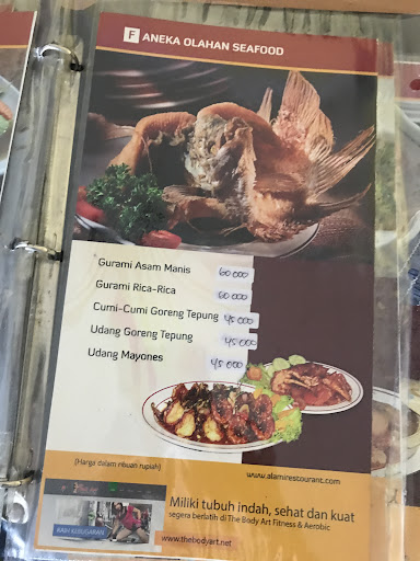 Read moreHari ini saya sekeluarga makan di alami resto.. harga dan pelayanan ok.. untuk rasa lumayan enak sich tapi tidak seperti yang saya bayangin sapo tahu : rasanya mirip capjai dikasih saos, warnanya merah. G seperti sapo tahu biasanya udang telur asin : seporsi isi 5 potong, usangnya cukup besar tapi saos telur asinnya g terasa telur asinnya, rasa bawang putih goreng dan asin garam.. rasanya lumayan enak sich tapi tidak sesuai dengan namanya gurami asam manis : saos asam manisnya rasanya, kalau untuk saya...